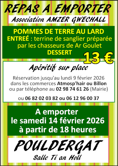 L'Association Amzer Gwechall propose un repas à emporter le 14 février 2026. :